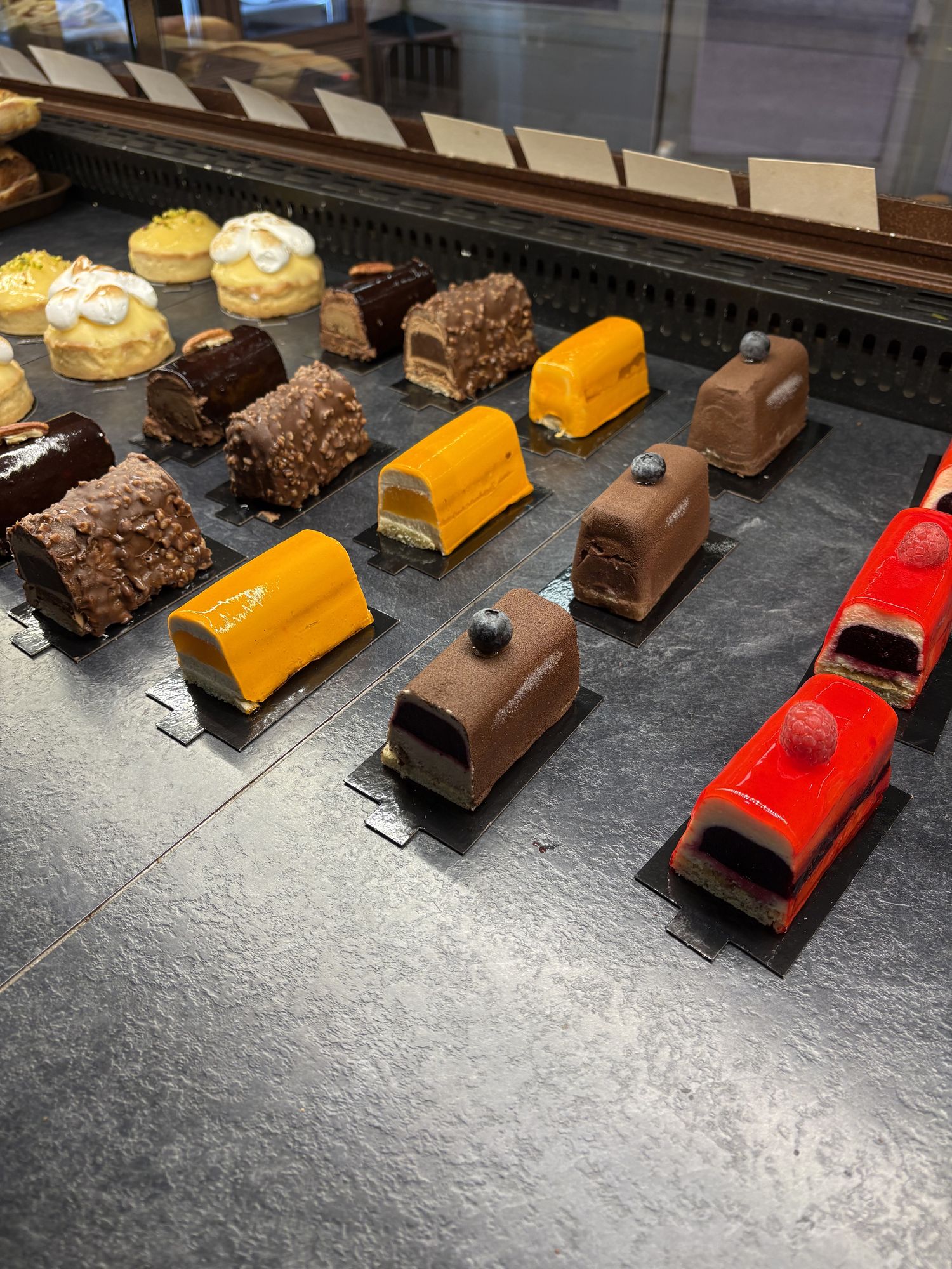 - Olympe (biscuit brownie pécan, crémeux caramel, insert praliné, mousse chocolat noir)
